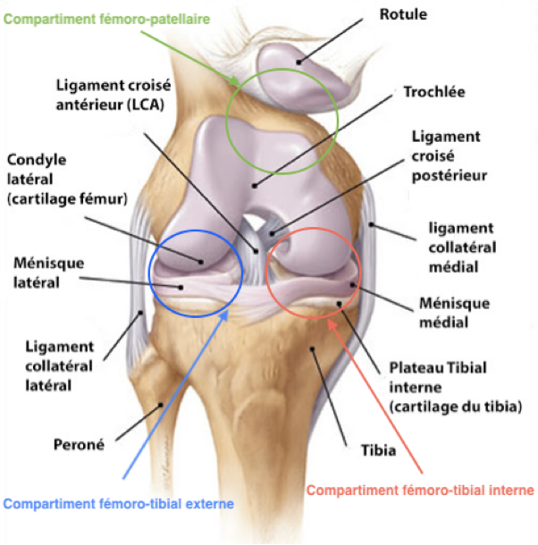 • Le compartiment fémoro-tibial interne ( car c’est l’endroit où s’articule le  fémur et le tibia à l’intérieur).